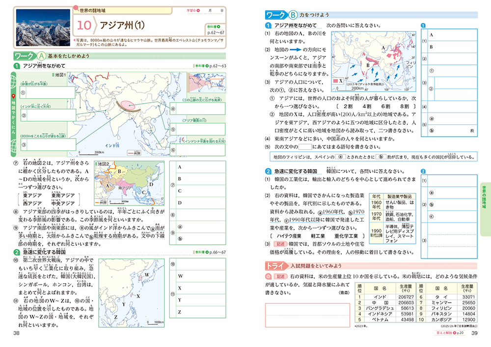 • 基本ページは、学習の基本をおさえる「ワークA」→少し発展的な内容の「ワークB」→入試問題を出題している「トライ」の3段階構成となっています。